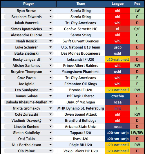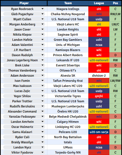 We see some more re-entries in here. Rocky Langvardt is captain of his U20 team in Leksand now with some… Rocky… SHL appearances thus far, but his skating looks more improved, and I still think there’s something interesting there. Galvas and Rheaume-Mullen are both dynamic offensive defenders who have continued to impress me this year.
